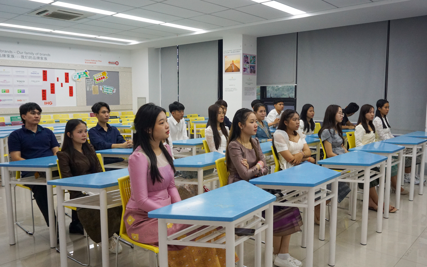 智慧旅游学院特别重视国际化教育氛围的营造,对教室进行了精心设计和布置。教室不仅展现了中国风采,还融入了老挝文化元素,旨在让老挝学生在熟悉的环境中更快融入学习。每一处细节都彰显着学院对国际教育的重视与尊重,为老挝学生提供了一个充满智慧与活力的学习环境。
