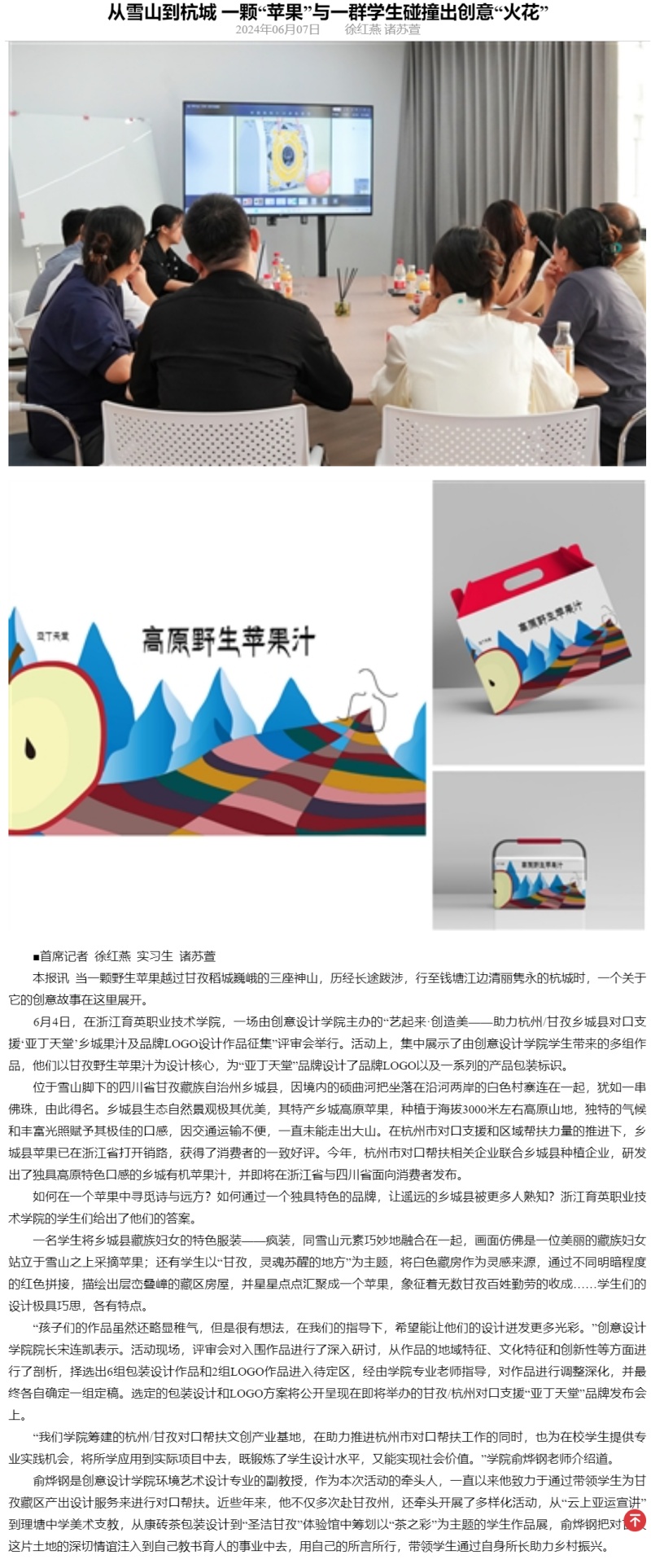 在助力推进杭州市对口帮扶工作的同时,也为在校学生提供专我们学院筹建的杭州/甘孜对口帮扶文创产业基地,业实践机会,将所学应用到实际项目中去,既锻炼了学生设计水平,又能实现社会价值。”学院俞烨钢老师介绍道。