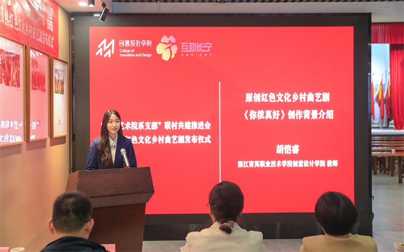 建德市人民政府副市长李俊,学校党委书记、副校长谢鑫,建德市杨村桥镇党委书记诸葛杰成,创意设计学院党总支书记、院长宋连凯共同发布原创红色文化乡村曲艺剧《你侬真好》。