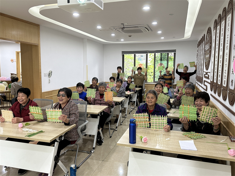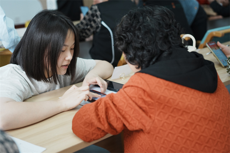 在“玩转智能手机”课堂中,同学们手绘了智能手机使用说明书,形象化展示了手机的常用功能,并一对一教他们拍照、上传视频、预约体检、网上买菜、下载音乐等。在“非遗”手工艺创作课堂,同学们在竹扇上书写了一个个“福”字,祝福老人们幸福健康。