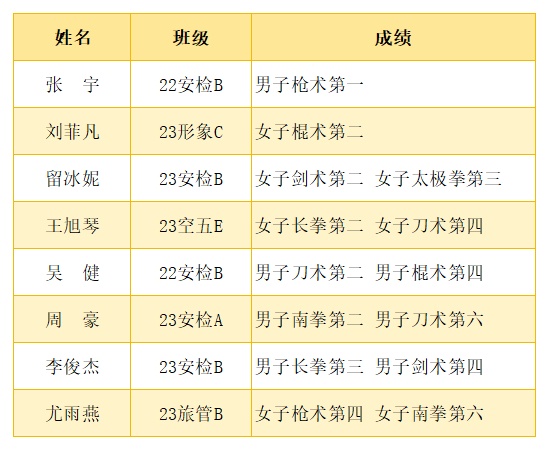 我校武术代表队8名运动员参加此次大赛的13个项目,经过3天的激烈角逐,我校运动员充分发扬顽强拼搏的体育精神,夺得1金5银2铜,男团第二,女团第三,总团第一。领队汤剑辉,主教练季勋龙,教练许洲。