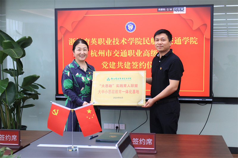 交通职高在育英学院挂牌设立“杭州市交通职业高级中学实践教学基地”和“大中小思政教育一体化基地”。谢鑫、祁长伟代表双方进行授牌。