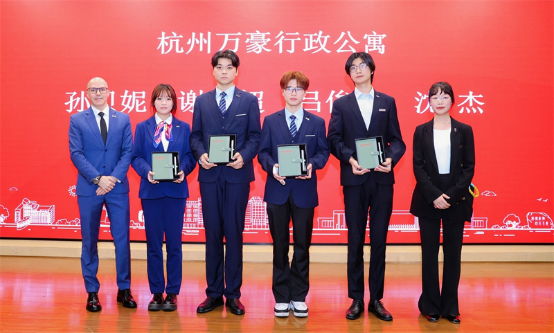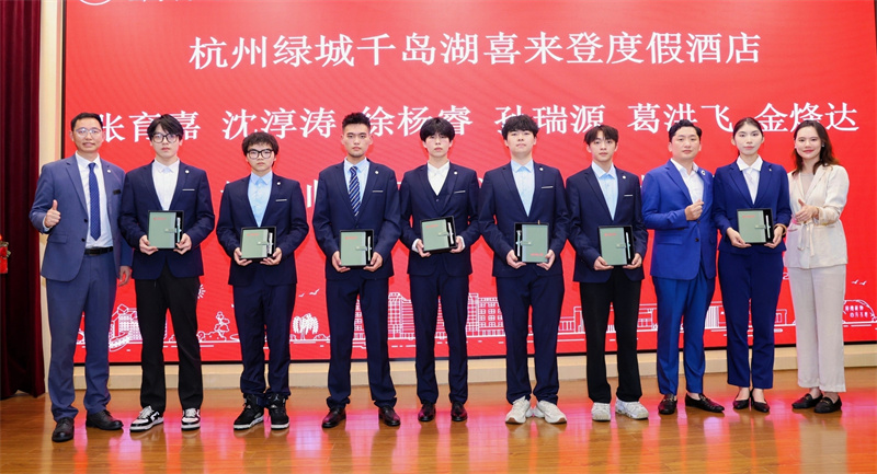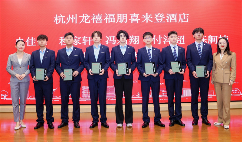 企业导师为“智慧酒店产业学院”第一批学员佩戴徽章并颁发纪念品。