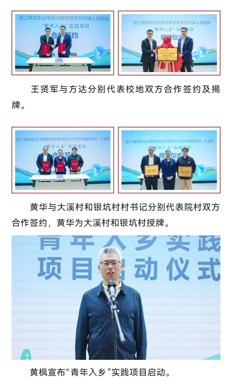 周人笔致辞。他说,安吉是中国美丽乡村发源地、绿色发展先行地。浙江是“千万工程”的重要源起地,是习近平总书记主政浙江期间亲自点题、亲自谋划、亲自部署、亲自推动的一项重大决策。青年是推动乡村振兴的关键因素和主体力量,青年入乡,让乡村更有活力,让乡村更富裕,让乡村更美好。希望校地双方深入合作,共同探索乡村振兴的新路径与新模式,探索更多符合乡村实际需求的合作项目;希望更多青年师生积极响应时代号召,投身美丽乡村开展实践,取得更多实践成果,为乡村发展注入更多新动力。