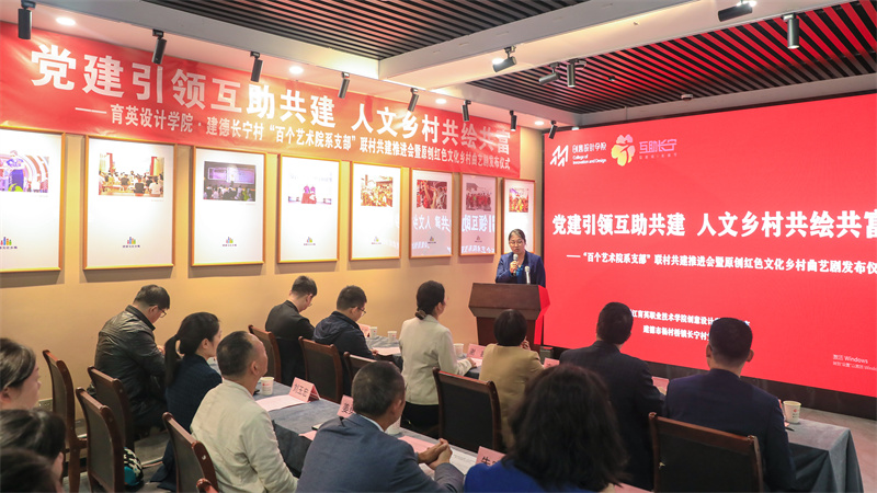 宋连凯介绍创意设计学院与长宁村联村共建项目成果及下一步工作设想。他说, 2020年以来,学院师生在长宁村设立8个助农共富工作室,赴长宁村累计开展活动40余场,参与师生1000余人次,帮助“互助洗衣房、互助养老、互助菜园”等“互助文化”落地生根,形成了“党建共建+设计助农”“互助长宁”经验模式,助力长宁村获批浙江省首批“红色根脉”强基示范村。下一步将继续深化“党建引领+设计助农”,通过艺术设计赋能长宁村文旅新业态,选派优秀年轻干部担任长宁村美丽乡村建设指导员,联合浙江省文化创意产业协会及高校力量,举办以长宁村乡村振兴为主题的设计赛事等。把长宁村的具体服务项目纳入学院各专业课程教学实践中,有目标、有指导、力求落地,帮助长宁村增加收益、扩大影响力。让更多年轻大学生走进长宁村,通过年轻创意激发乡村活力。希望创意设计学院与长宁村的共建项目不断深化、成为浙江高校百个艺术院系支部联村共建的示范项目、品牌项目。