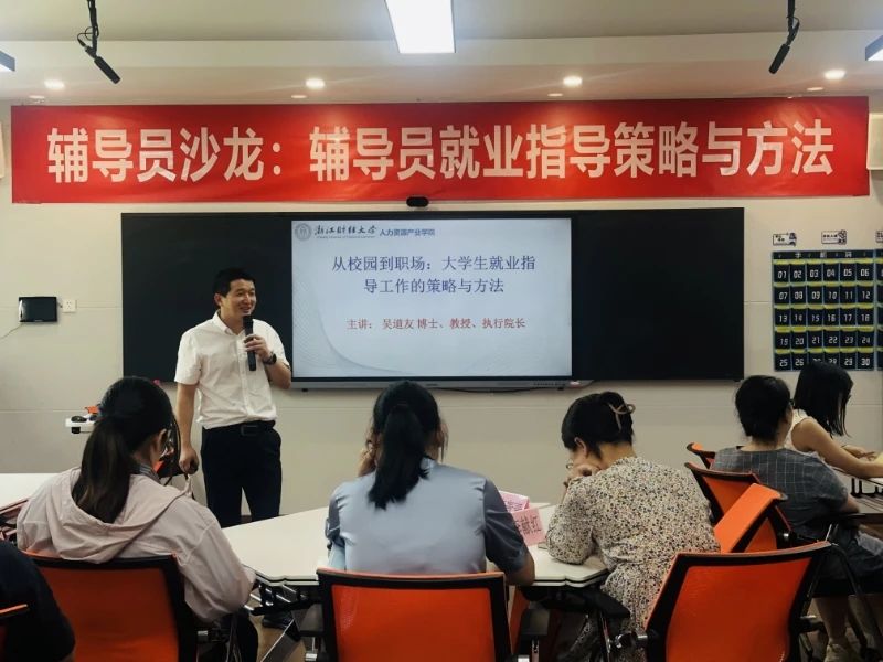 6月6日下午,一场以“从校园到职场:大学生就业指导工作的策略与方法”为主题的辅导员沙龙活动在3213实训室举行。沙龙特邀校浙江财经大学人力资源产业学院执行院长、博士吴道友教授担任主讲嘉宾,吸引了来自本校及浙江经贸职业技术学院、杭州职业技术学院的27名辅导员和就业指导教师参与,共同探讨数智时代背景下的就业指导创新路径。