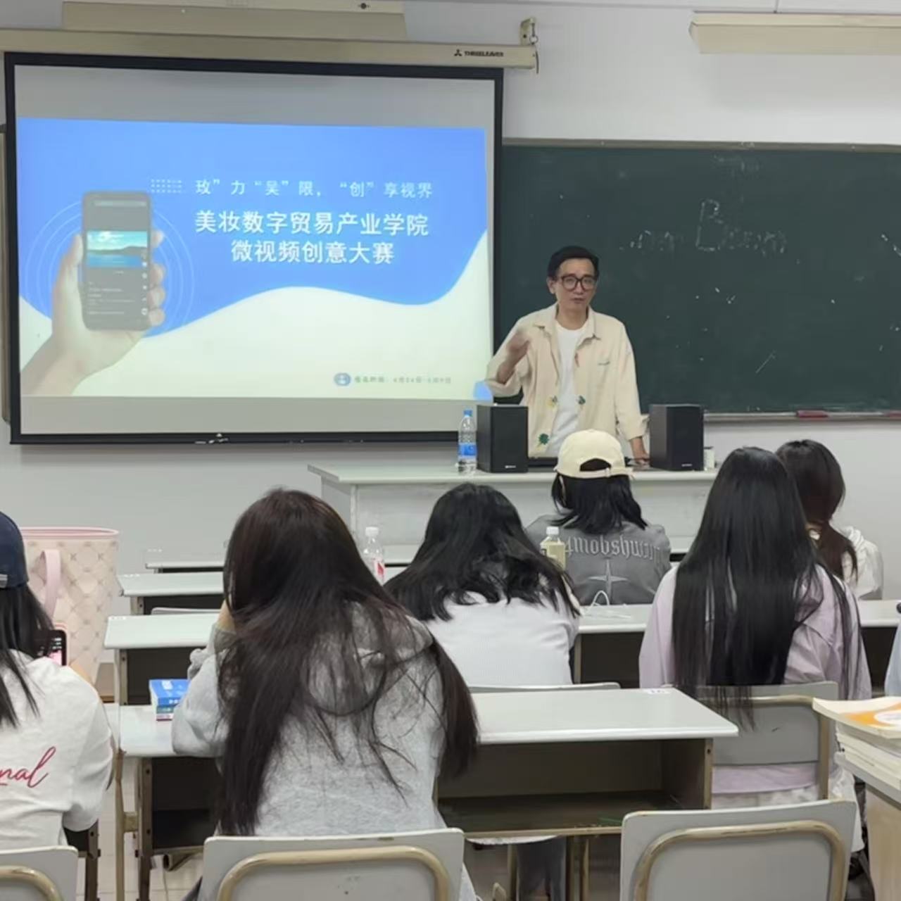 在会上,郑天老师首先介绍大赛背景。本次比赛由美妆数字贸易产业学院主办,聚焦抖音短视频赛道,设美食、美景、美宿、美妆四大主题,针对创作要求,郑老师从视频拍摄技术标准与剪辑规范两方面展开说明。他特别指出:“剪辑需注重转场流畅度与配乐适配性,画面中不得出现参赛人的信息,需严格遵守抖音发布规则。然后他提醒同学们比赛将从视频质量、应用价值、创新创意三方面评审,其中创新创意占比20%,鼓励尝试AI特效、多镜头叙事等视频编辑技术。”奖项设置上,一、二、三等奖分别占比10%、20%、30%,获奖者均可获得证书、奖品及综合测评加分。班会最后,郑老师再次鼓励同学们:“去年《美妆小镇十二时辰》凭借‘美妆+非遗’创意摘得一等奖,今年期待大家突破传统,用镜头展现‘美’的多元可能。”现场气氛热烈,同学们纷纷组队讨论选题,尝试从不同的素材中找到创作的亮点。