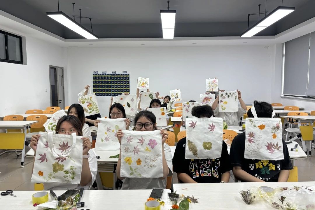 在45分钟的拓印实践环节,参与者以校园中随处可见的鲜花、枫叶等新鲜植物为素材,在轻柔的背景音乐中专注创作。同学们将叶片与花瓣精心排列于帆布包上,通过敲打、拓印,将植物的脉络与色彩永久定格。过程中,大家互相分享减压心得,现场氛围轻松融洽。会计专业学生小李表示:“敲拓的过程像一场冥想,植物的清香和规律的敲击声让我感到前所未有的平静。”最终,一幅幅独具匠心的拓印作品跃然呈现,既有自然之美,亦承载着个人情感。