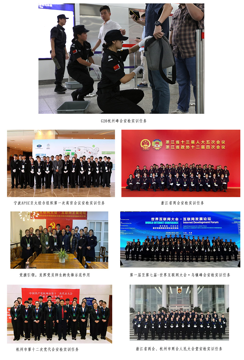 以真实企业项目创新打造“理论+实践”教学模式,课堂不再局限于校园,将实践教学融于一系列重大高端国际会议,如G20杭州峰会、世界互联网大会乌镇峰会、宁波APEC会议、浙江省两会等大型国际会议,以及外国政要来杭涉外安检项目,将安全检查技术充分运用到社会公共安全保障服务中,形成良好的安检品牌效应;党旗引领,发挥党员师生的先锋示范作用,将学生实训与思政教育相融合,使每位参与者得到能力提升、实现自我价值,融入到促进“两个文明”的建设中,实现“品质与技能相融合、课程与实际岗位相融合”的双融合人才培养模式。