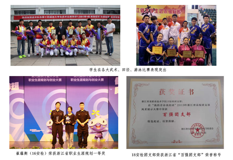 全真的专业实战项目培养了学生严谨细致的职业品质、良好的沟通能力、沉稳的事件处置能力、团队协作能力和凝聚力,专业人才培养质量不断提升。安检专业班级先后荣获"浙江省高校百强团支部"、"开发区先进团支部"称号,安检服务社团获得学院“十佳社团”称号,省大学生运动会、省武术、省游泳、省田径等项目捧回一枚枚沉甸甸的金银牌达四十多枚,三好学生、院十佳大学生不断涌现。安检专业已成为浙江省现代安检服务人才培养基地。