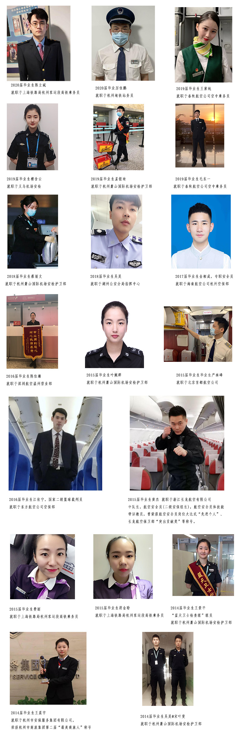 本专业毕业生可从事机场安检及地勤、空中乘务(安全员方向)、航空运输安全管理,巡特辅警,高铁、地铁、港口、长途客运、物流、邮局、海关及重要场馆的安全检查及相关管理岗位。随着交通运输业的快速发展,特别是杭州、宁波、温州等城市轨道交通的相继开通,地铁安检巨大的人力资源缺口为安检专业学生提供了广阔的就业空间。