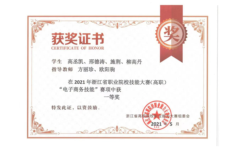 ●2021年获浙江省职业院校技能大赛(高职)“电子商务技能”赛项一等奖,浙江省第十六届大学生电子商务竞赛二等奖;